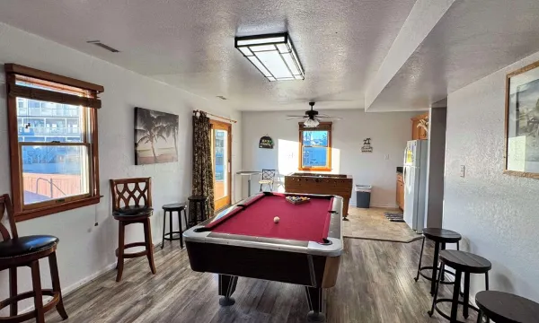 With private pool, hot tub, game room with foosball and pool table, volleyball, basketball, walking distance to Rodanthe Pier, CAROLINA BREEZE provides for all your vacation needs. Relax by the pool or lounge on the sundeck with picnic table. Step inside to the game room with pool table, foosball, 50' LCD TV and wet bar with full size refrigerator and microwave and convenient half bath. There are 2 bedrooms on this level including one master. The second level has 4 bedrooms, including 2 masters and 2 bedrooms sharing a bathroom. All of the bedrooms in this home have TVs. Also on this level are the laundry area and bubbly hot tub on a covered deck with views of the ocean and sound. On the top level you'll enjoy the well-furnished great room featuring 51' LCD TV, that opens onto a spacious sundeck perfect for ocean memories. The fully equipped kitchen with breakfast bar, large dining area and screened porch will keep the chefs happy. Enjoy sunsets over the sound from the king master bedroom's cozy window seat. This is a home that everyone will enjoy year after year! So take a dip in the pool, a stroll on the beach, and relax in the CAROLINA BREEZE. If this house is booked..checkout my other 6 bedroom ( all master) house in Salvo