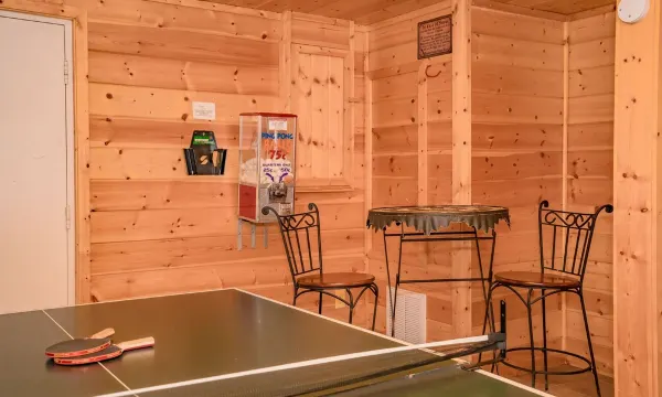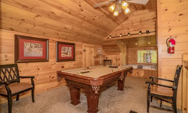 The Main level of this cabin has a living room area with a leather sleeper sofa and 48-inch wide screen cable TV with DVD player. There is a fully equipped kitchen, park-style charcoal grill (Charcoal, lighter, and lighter fluid not provided) just outside and dining for 6 at the table or take your meal on to the deck and enjoy the view seated on the comfortable patio furniture, which includes two tables for your convenience. Adjacent the living room is the first master suite, which has a luxurious king size log bed and adjoining full bath with tub/shower and pedestal sink. The second master suite also offers a plush king size log bed and the second full bath is adjoining the bedroom and also opens to kitchen/living room. Upstairs area offers an 8-foot pool table, game table with checkers, chess, a relaxing indoor Jetted tub, half bath, CD player and LED TV with DVD player beside a wet bar that also has a small sink. The lower level (accessible from exterior of house) has a full size washer and dryer along with a full regulation size ping pong table complete with a ball dispensing machine and 4 paddles. Outside, there is a beautiful full-length deck that holds the 7-person hot tub and a willow swing, perfect from which to enjoy the spectacular view from the lower level.