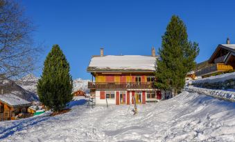 Cosy, rustic chalet "Fortuna", 1'650 m a.s.l., 3 storeys. On the outskirts, 700 m from the centre, in a quiet, sunny position, 700 m from the skiing area. For shared use: garden, lawn for sunbathing. In the house: storage room for skis, central heating system, washing machine (for shared use). Motor access to 700 m from the house. 700 m footpath to the house. Public parking 700 m. Shop, grocery 700 m, restaurant 200 m, bus stop 700 m, indoor swimming pool 100 m. Tennis 600 m, ski lift, gondola lift, skisport facilities, slopes, ski school, sled run 700 m, ice rink, children's playground 500 m. Please note: car-free holiday complex. Luggage can be transported (extra) by electric taxi from the village square / parking garage (extra) to the house. "Heimine", 3-room apartment 85 m2, on the ground floor. Cosy furnishings: living room with cable TV (flat screen), radio and hi-fi system. Exit to the patio. 1 double bedroom. 1 double bedroom with hand-basin. Kitchen (oven, dishwasher, 4 ceramic glass hob hotplates, kettle, microwave, electric coffee machine, Capsules for coffee machine (Nespresso), raclette grill, fondue Set (cheese)) with dining table. Shower/WC. Patio 50 m2. Terrace furniture, deck chairs. Partial view of the mountains, the countryside and the resort. Facilities: baby cot. Internet (WiFi, free). Please note: non-smokers only. Maximum 1 pet/ dog allowed. Double room with washbasin is outside the apartment. Access in the corridor next to the apartment door.