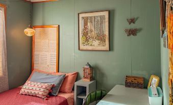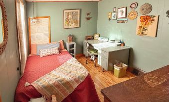 Off the kitchen you will also find the bathroom. The main light is just outside the bathroom door (quirky old house charm) and another light above the shower can be turned on with the switch to the left of the shower. To the right of the shower is a switch for the fan. The bathroom will be stocked with a first aid kit and some feminine products, ten large towels under the sink, wash cloths, and a few hand drying towels. If you need more towels than that, please bring yourself some extras, or for a more extended stay, feel free to request extras.