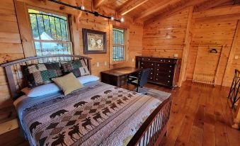 Ascend the cabin's charming wooden staircase to reach the loft bedroom. This open and inviting space offers a unique atmosphere with it's elevated vantage point and lovely river view. The loft bedroom boasts a cozy queen-sized bed, a half bath, a workstation, and a warm and rustic ambiance, making it a great choice for a productive day and a peaceful night's sleep.
