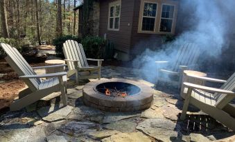 Antique cabin in the woods with incomparable charm. Gourmet kitchen, (microwave and insapot above pantry). Screened in porch , 2 fire pits, lots of lounging area with over sized chaises. Covered parking, WiFi and Apple TV. Unlimited hot water and backup generator.