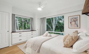Unwind in comfort in the master bedroom with ensuite and built-in robes overlooking the trees and Wongawallan valley bushland. An additional Queen bedroom includes full wardrobes, and the two single beds in the third bedroom can comfortably accommodate an extra trundle bed upon request.
